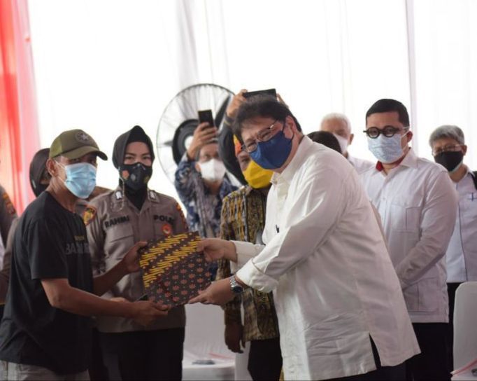 Bersama Menteri Keuangan Sri Mulyani, Menko Airlangga berdialog dengan para penerima bantuan.