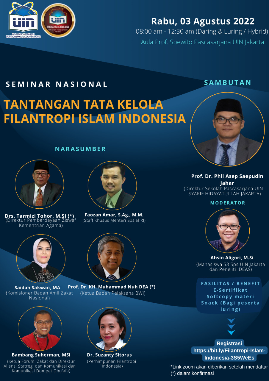 Pembicaranya adalah Direktur Sekolah Pascasarjana Asep Saepudin Jahar, Direktur Pengembangan Ziswaf Kemenag RI Tarmizi Tohor, Komisioner BAZNAS RI Saidah Sakwan, Ketua Forum Zakat Nasional Bambang Suherman, Ketua Pelaksana BWI Muhammad Nur, Staf Khusus Kemensos Faozan Amar dan Perhimpunan Filantropi Indonesia Suzanty Sitorus dengan moderator Ahsin Algori. Acara ini dilakukan melalui aplikasi zoom meeting 75 orang dan sisanya secara off line di Aula Prof Suwito Sekolah Pascasarjana UIN Jakarta