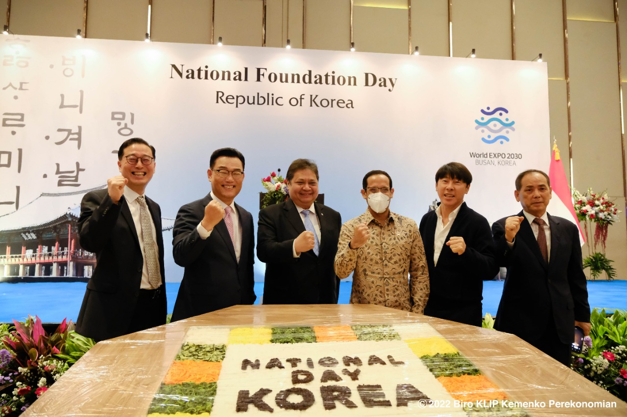Menko Airlangga juga menyampaikan ucapan selamat kepada Pemerintah Korea Selatan dan rakyat Republik Korea Selatan atas peringatan Hari Kelahiran Bangsa Korea. Korean National Foundation Day (Gaecheonjeol) atau Hari Kelahiran Bangsa Korea merupakan hari libur resmi di Korea Selatan yang diperingati setiap tanggal 3 Oktober. Gaecheonjeol ini diperingati untuk merayakan pendirian kerajaan pertama Korea yang bernama Gojoseon.